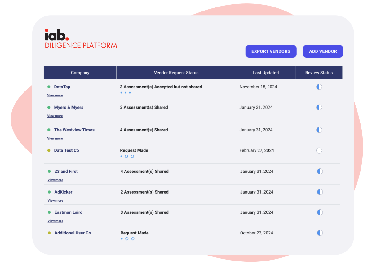 The IAB Diligence Platform is a unique, collaborative solution developed by the Interactive Advertising Bureau (IAB) and SafeGuard Privacy. It is tailor-made to address the specific, detailed needs of the digital advertising industry.