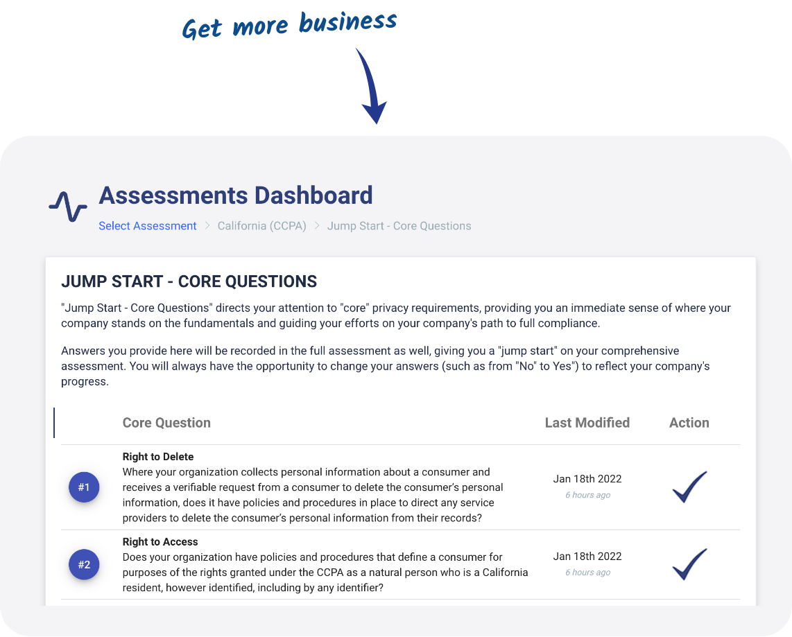 Speed to compliance: We wrote all the questions for you. Additionally, JumpStart questions are a subset of our full assessments and will quickly give you a sense of where your company stands on each law and which critical gaps put you at risk.